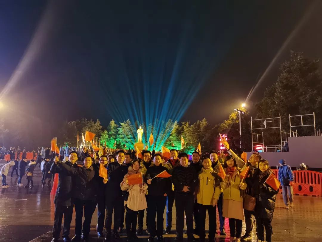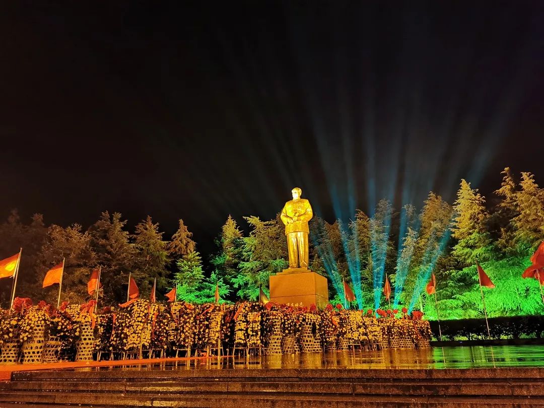 入夜后,毛澤東廣場依然人潮如織,紅歌回蕩,雖是寒冬雨夜,韶山卻絲毫不冷清,紅星會(huì)展一行手捧鮮花、高舉旗幟,在廣場上唱紅歌、舞紅旗,與現(xiàn)場的民眾一起組成了紅色的海洋,韶山一夜無眠。