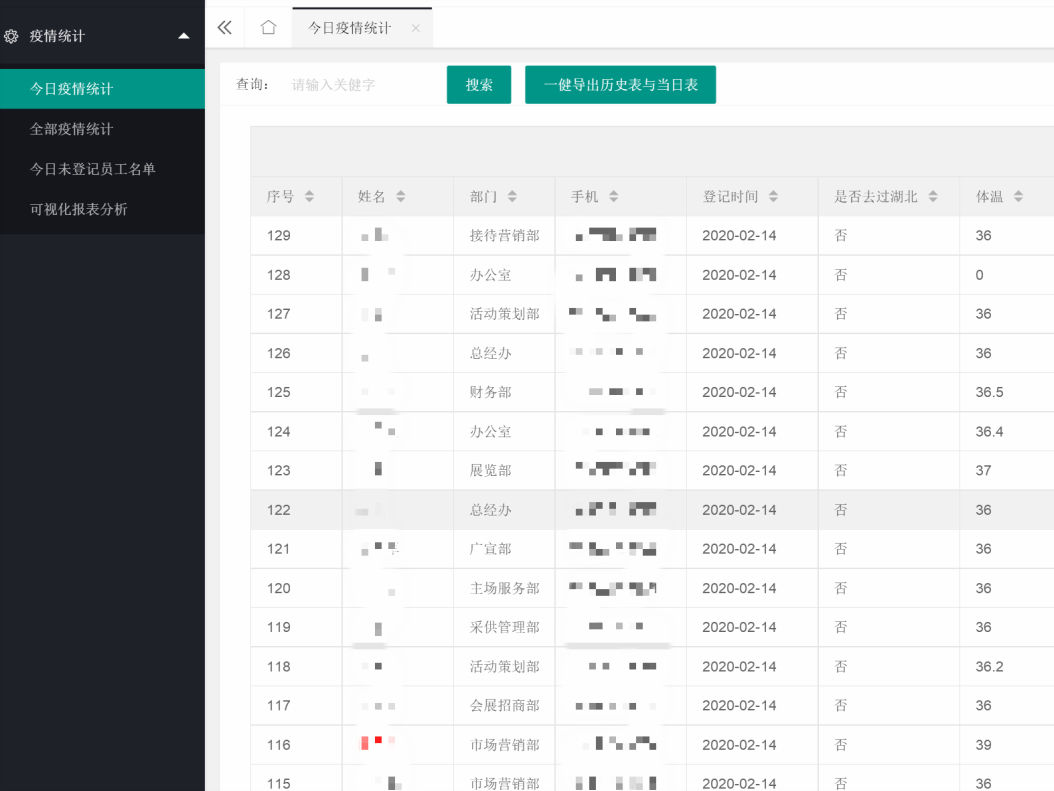 疫情防控工作刻不容緩,早在復工之前,紅星會展便已對全體員工的健康狀況進行了摸底調(diào)查。公司辦公室緊急開發(fā)了疫情防控信息系統(tǒng),從2月3日開始,每天都對全體員工進行了發(fā)燒發(fā)熱的情況統(tǒng)計,并將數(shù)據(jù)上報集團和上級單位。