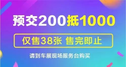車展期間,預(yù)交200元現(xiàn)金購買“抵用券”,即可在購車時(shí)直抵1000元現(xiàn)金,僅售38張,售完即止。你會(huì)是那幸運(yùn)的1/38嗎?