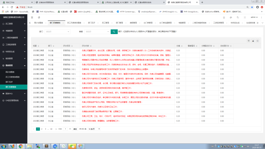 其中,紅星會(huì)展信息化管理系統(tǒng)是基于提高員工工作效率、進(jìn)行內(nèi)部工作統(tǒng)籌、實(shí)現(xiàn)部門和員工績(jī)效統(tǒng)計(jì)等內(nèi)容,涵蓋合同管理、預(yù)決算管理、簽呈督查、資產(chǎn)督查、部門職責(zé)職能督查、安全生產(chǎn)督查、員工職責(zé)職能考核、用餐登記、考勤打卡、會(huì)議督查、周計(jì)劃督查、部門互評(píng)等功能模塊。