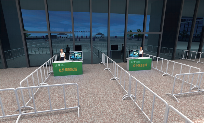 3.體溫必測:所有進館人員要經(jīng)過兩次體溫測量,一次在場外人工測溫,第二次在進行安檢時同步經(jīng)紅外測溫機器人測溫,正常情況下方可進入場館。