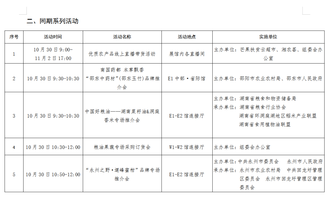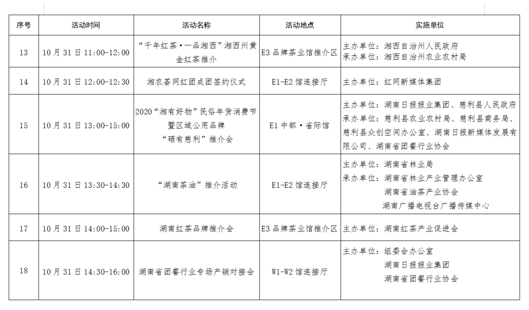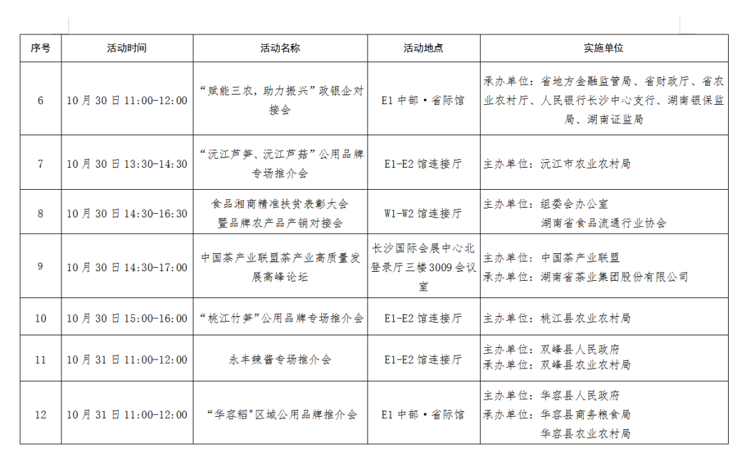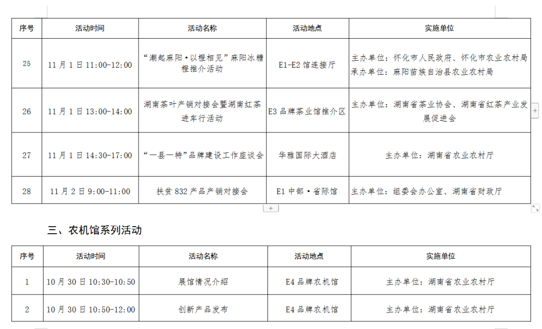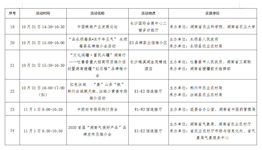 本屆展會在為期5天的展會期間(10月30日至11月3日),以“辦好中部農(nóng)博會,助力脫貧奔小康”為主題,共設(shè)立中部·省際館(E1館)、湖南主題館(E2館)、品牌茶業(yè)館(E3館)、品牌農(nóng)機館(E4館)、品牌產(chǎn)業(yè)1館(W1館)、品牌產(chǎn)業(yè)2館(W2館)、綜合館(W3館)、湖南美食館等八大展館(W4館)。