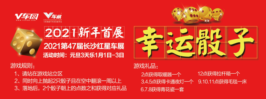 2021年1月1日—3日,來長沙紅星國際會(huì)展中心,參加2021年第47屆長沙紅星車展首展、萌卡2021長沙動(dòng)漫節(jié),近距離看網(wǎng)紅、明星表演,搖動(dòng)幸運(yùn)骰子,為你們的幸福添足喜氣,為你們的2021年“加滿油”。