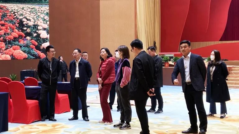 這是一場與時間賽跑的工作,紅星會展一邊調(diào)集人手根據(jù)大會氛圍對現(xiàn)場布置進行管控,一邊安排對音響、燈光、屏幕等設(shè)施設(shè)備進行統(tǒng)一安裝與調(diào)試。