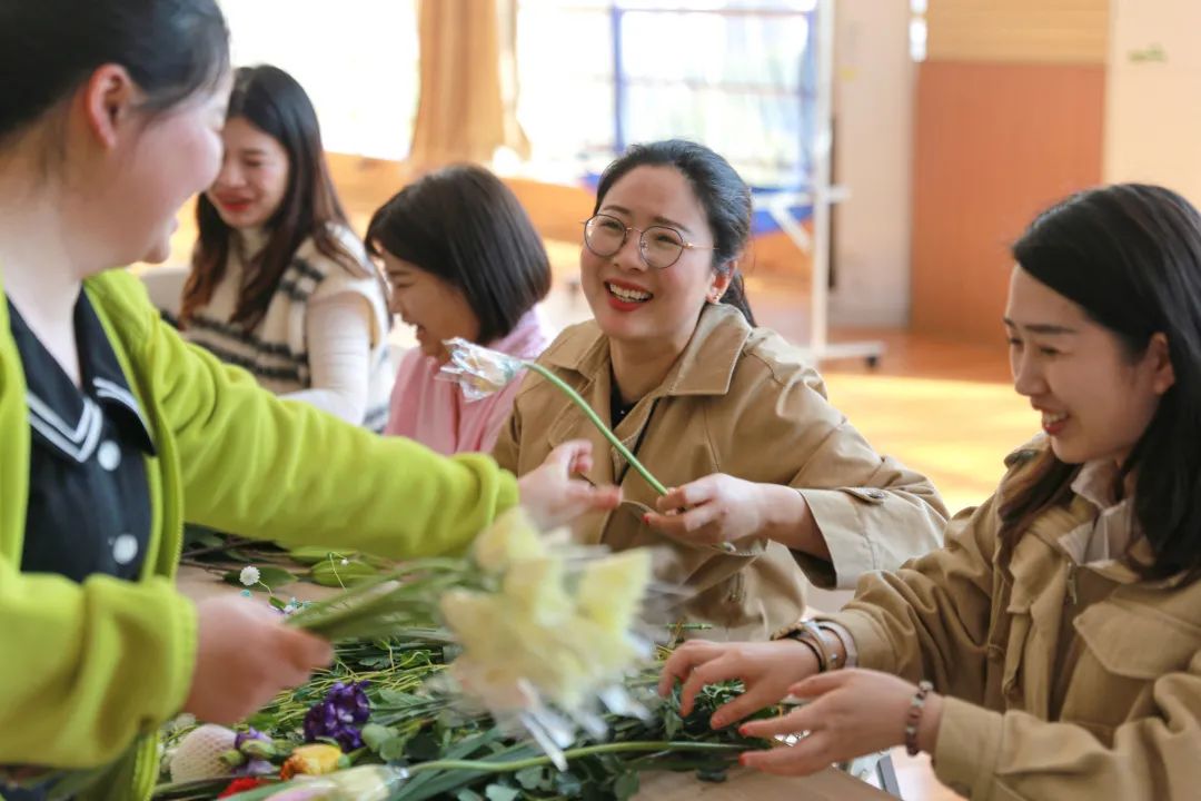 在輕松愉快的氛圍中,女職工們拿起花枝,充分發(fā)揮想象力,按照色彩、層次搭配、整體造型等花材特點和審美情趣,對鮮花進行選材、剪葉,忙得不亦樂乎。